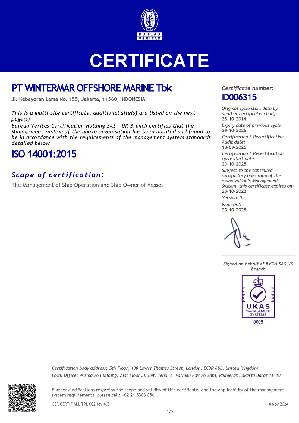 ISO 45001:2018 – Occupational Health & Safety System - The Company fully complies with international maritime regulations and codes, including: ISM, ISPS, SOLAS, STCW, MLC, IMCA, and OCIMF.